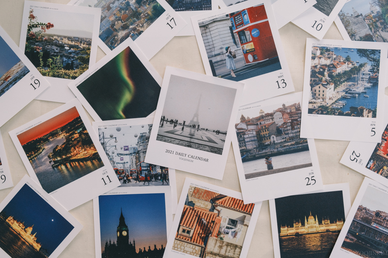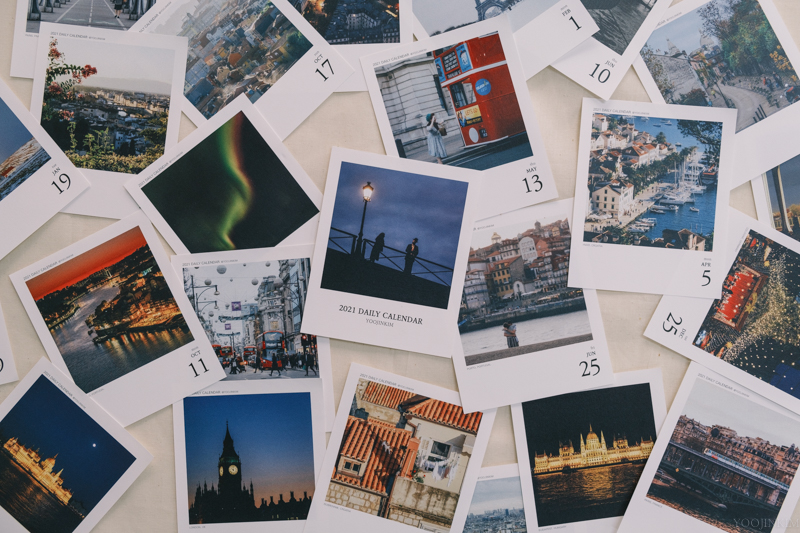 올해 코로나로 파리에 못 갔습니다. 원래는 올봄에 파리에 갔어야 했는데, 저도 많은 분들과 마찬가지로 항공권 취소 (당)하고 보다 안전한 한국에서 어디에도 안 나가는 생활을 했어요. 그래서 더 이상 사진이 없냐? 그럴 리가. 사실 그간 찍어왔던 파리 사진만 몇 만장이고 그중 다만 들어갈 자리가 없어서 일력에 선택받지 못한 사진들이 수두룩합니다. 그래서 다시 파리 사진을 끄집어내볼까 고민을 해보다가, 사실 이게 판매를 하고는 있지만 애초에 판매 목적으로 시작한 것이 아니라, 저도 지난 여행과 제 사진을 정리하는 느낌으로 만들었던 것이기 때문에... 파리 사진을 다시 들여다보는 것은 큰 의미가 없다고 생각하여... 작년엔가 재작년부터 생각만 해봤던 다른 도시들 사진을 담자,고 정했어요. 파리에 살면서 좋았던 점은, 서울에서 제주 가듯 유럽여행을 할 수 있다는 것이었습니다. 자랑은 아닌데 저는 좀 먼 미래를 위한 저축을 잘 하지 않...았어서 파리 살면서도 돈이 좀 모이면 놀러 가고.. 놀러 가고... 했어요. 아 아무튼 인스타그램이나 블로그에는 종종 올렸지만 파리가 아니라는 이유로 일력으로는 빛(?과연?)을 보지 못한, 다른 도시에서 담은 소중한 사진들을 이번 일력에 담았습니다. 그래서 그게 어디냐면요. 우선 파리는 당연하고, 런던, 포르투, 바르셀로나, 암스테르담, 프라하, 부다페스트, 로마, 피렌체, 베니스, 베를린, 쾰른, 브뤼셀, 브뤼헤, 겐트, 코펜하겐, 두브로브니크, 마카르스카, 스플리트, 흐바르, 자다르, 인터라켄, 루체른, 체르마트, 장크트길겐, 그리고 아이슬란드까지... 365장 들어갑니다. '다음 날은 어떤 사진일까'에 이제 '어떤 도시일까'를 추가해보았습니다. 그래서 이번 일력에는 사진 아래에 작게 도시명이 적혀있어요. 날짜, 요일에 이어 요거 일일이 적느라.. 작년보다 일주일이 늦었습니다.